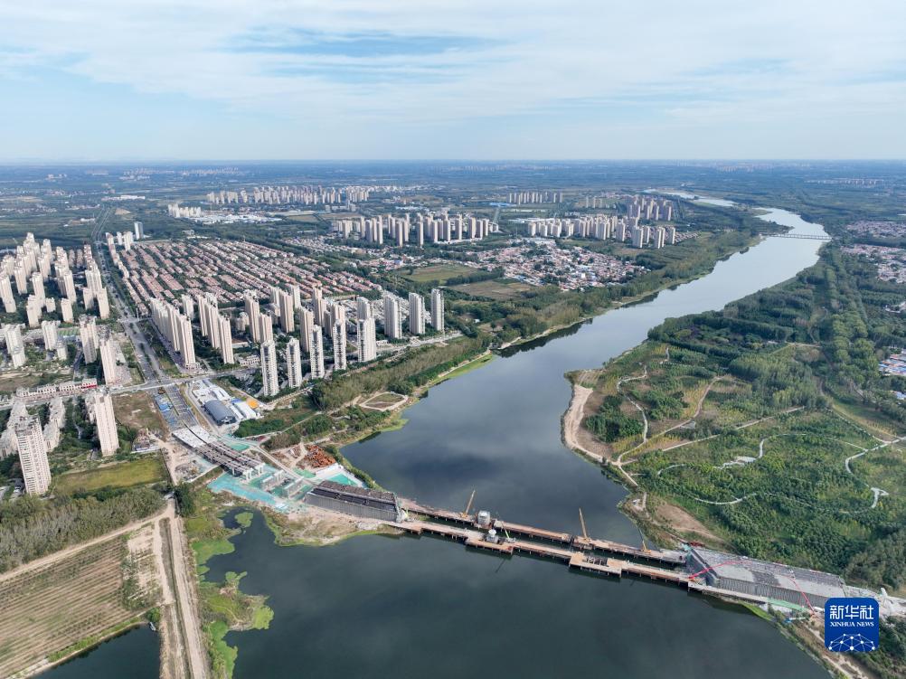 10月4日拍攝的廠(chǎng)通路潮白河大橋施工現場(chǎng)(無(wú)人機照片)。