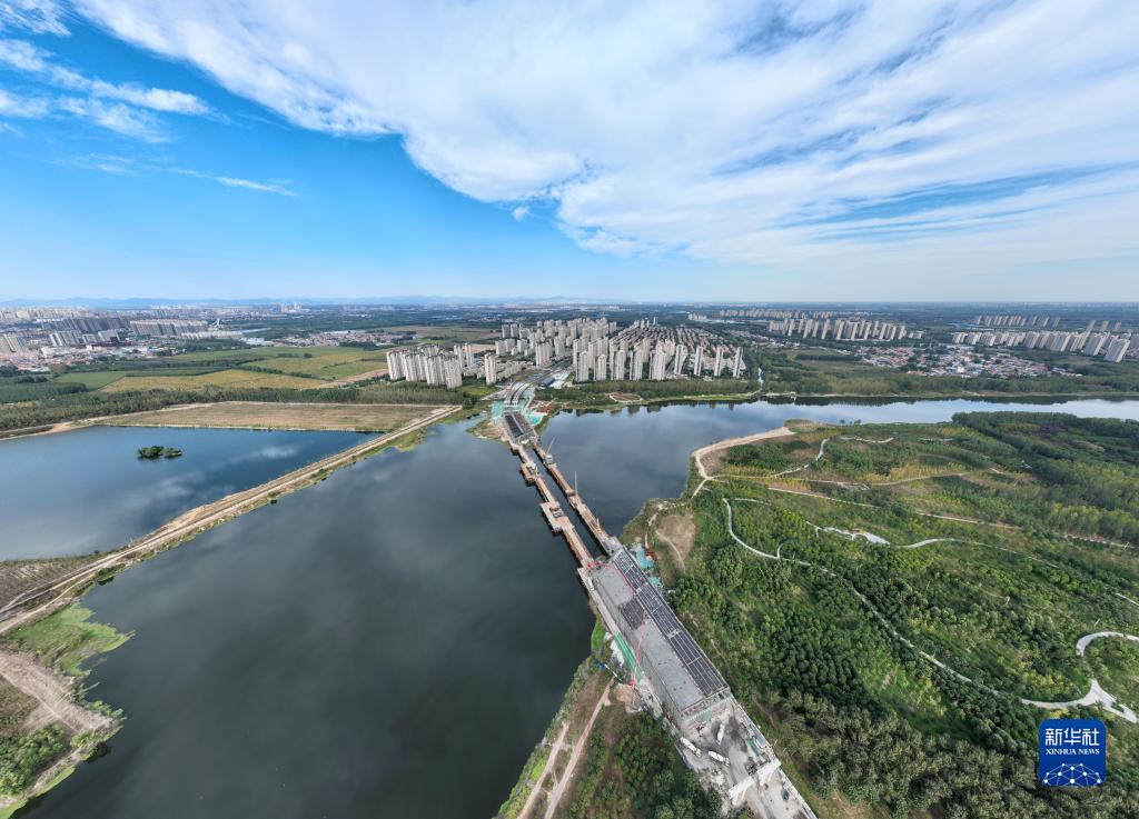 10月4日拍攝的廠(chǎng)通路潮白河大橋施工現場(chǎng)(無(wú)人機照片)。