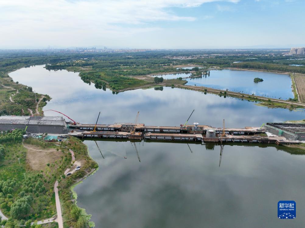 10月4日拍攝的廠(chǎng)通路潮白河大橋施工現場(chǎng)(無(wú)人機照片)。