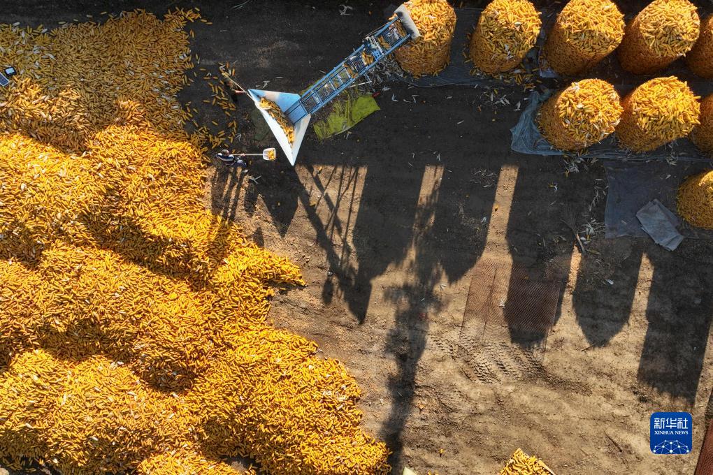 10月5日,在山東省聊城市茌平區胡屯鎮北田村,村民將玉米裝囤(無(wú)人機照片)。