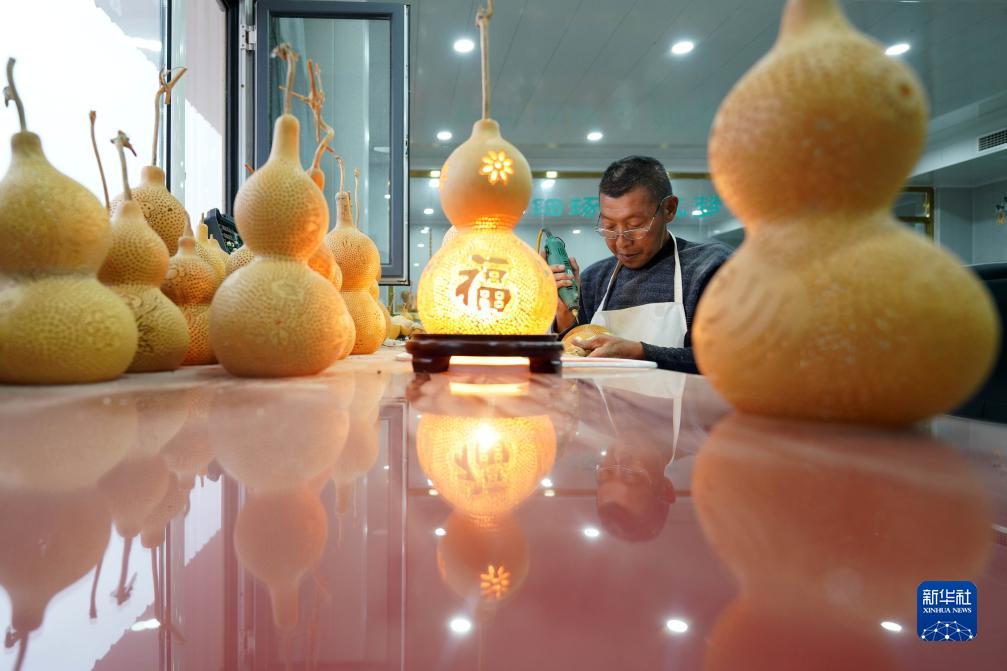 10月5日,河北省邢臺市信都區會(huì )寧鎮張爾莊村的葫蘆雕刻藝人在制作葫蘆燈。