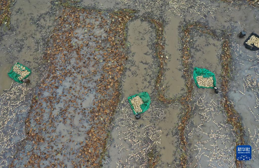 10月5日,河北省新河縣西流鄉西董村一家蓮藕種植合作社的社員在收獲蓮藕(無(wú)人機照片)。