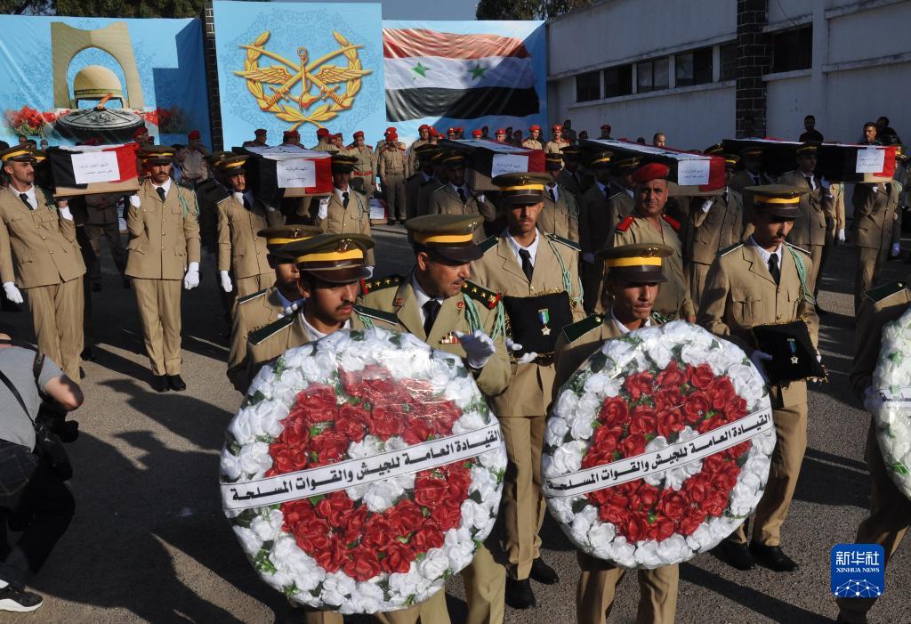 10月6日,敘利亞士兵在霍姆斯參加無(wú)人機襲擊遇難者葬禮。