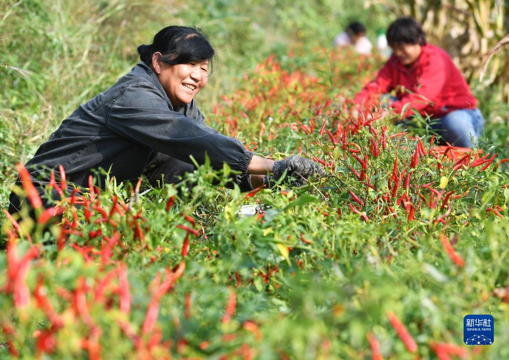 10月7日,河北省石家莊市井陘縣南峪鎮地都村農民在山間梯田采摘辣椒。