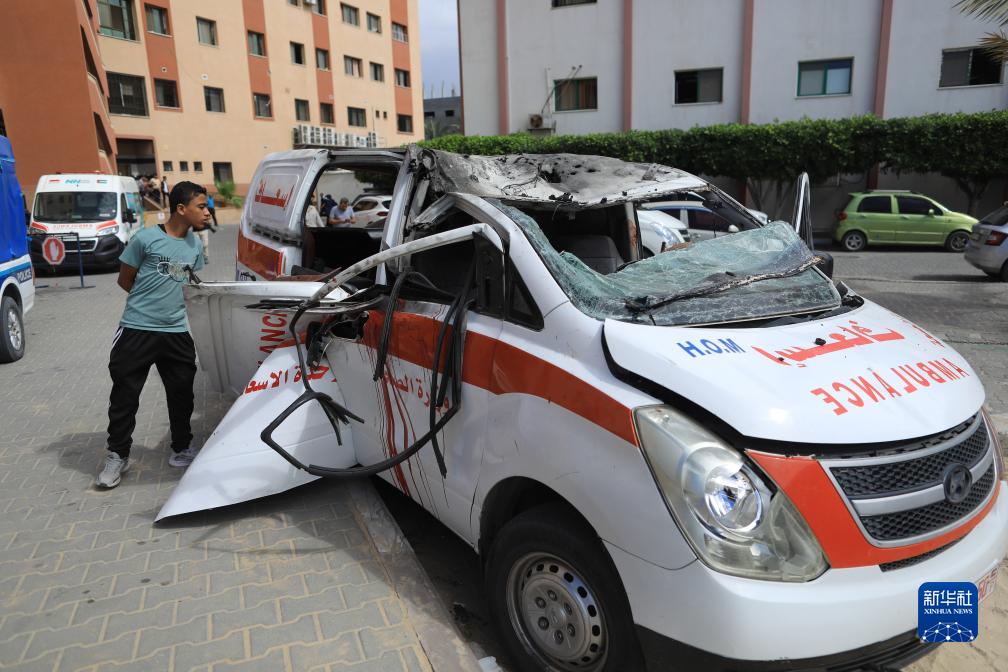 這是10月7日在加沙地帶城市汗尤尼斯拍攝的在以色列空襲中受損的救護車(chē)。