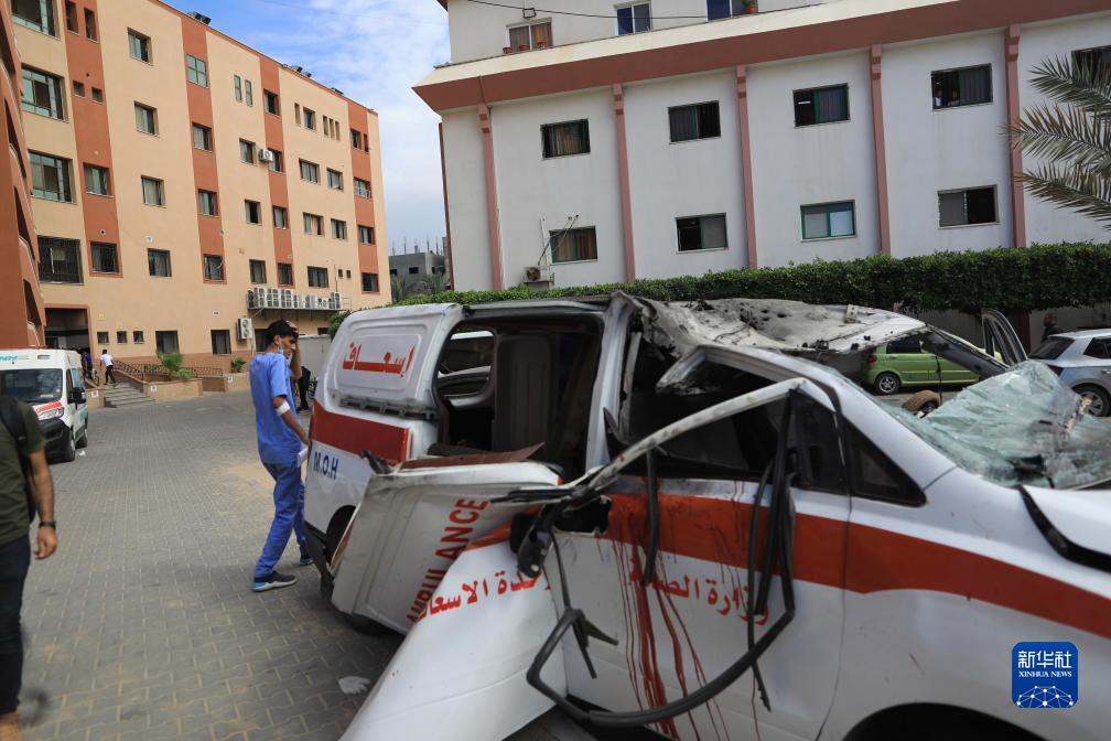 這是10月7日在加沙地帶城市汗尤尼斯拍攝的在以色列空襲中受損的救護車(chē)。