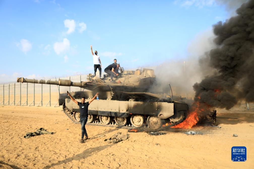 10月7日,在加沙地帶城市汗尤尼斯以東的邊境地區,巴勒斯坦人出現在一輛以色列坦克附近。