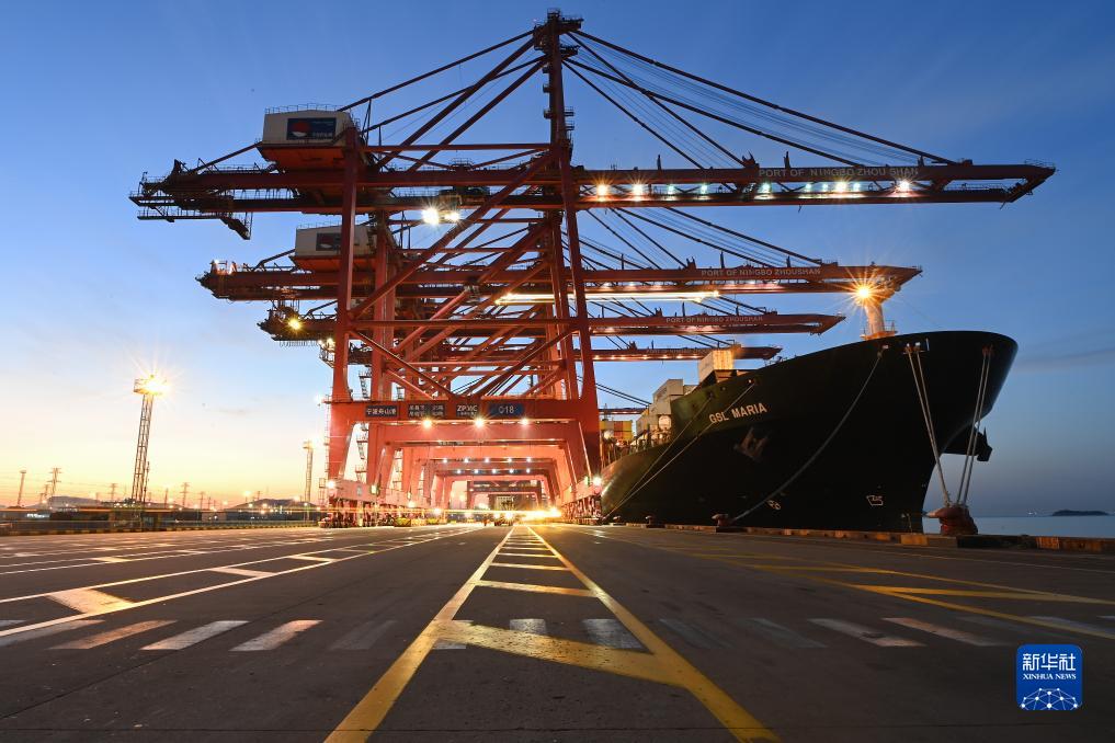 一艘貨輪??吭趯幉ㄖ凵礁鄞┥礁蹍^集裝箱碼頭(2023年1月31日攝)。