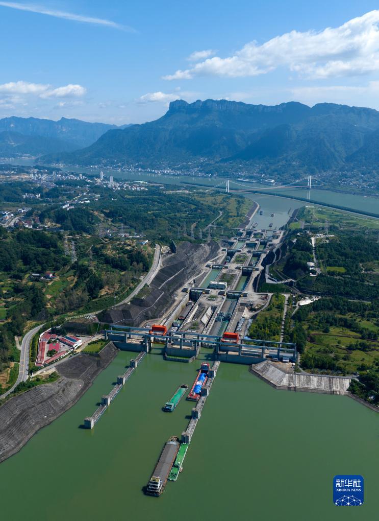 10月8日,在湖北省宜昌市,船舶有序通過(guò)三峽雙線(xiàn)五級船閘(無(wú)人機照片)。