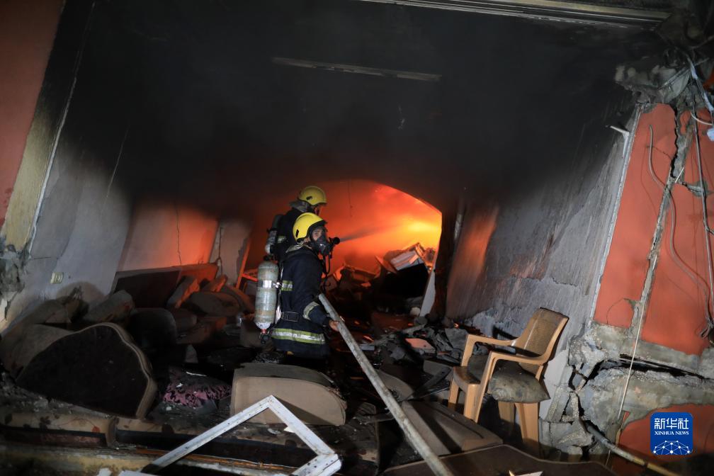 10月8日,巴勒斯坦民防人員在加沙地帶南部城市汗尤尼斯一處被以色列空襲的民宅滅火。