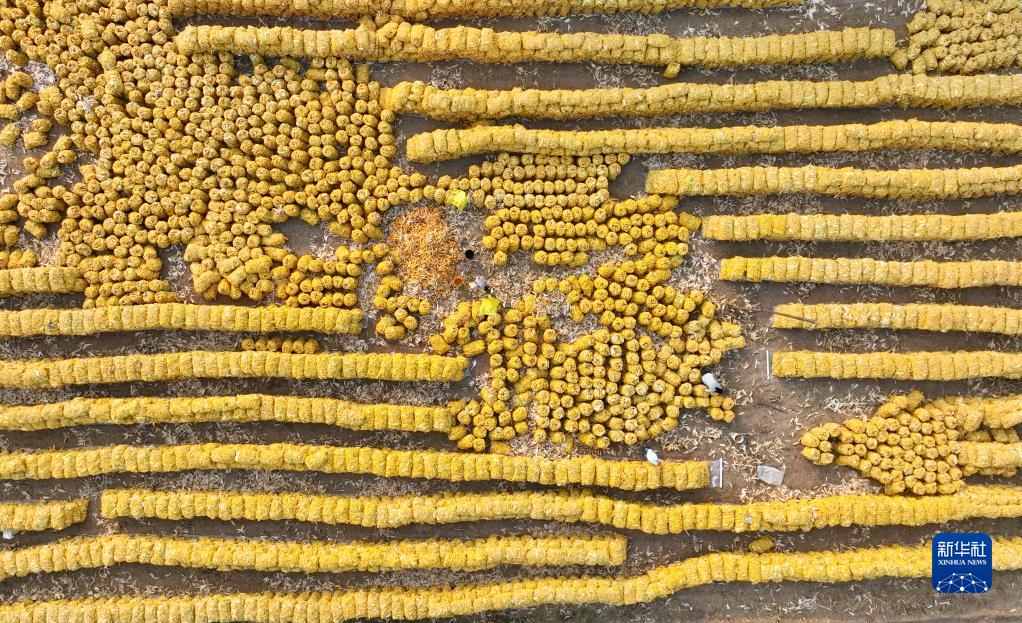 10月8日,農民在河北省隆堯縣雙碑鄉亦城村一處玉米收儲點(diǎn)內勞作(無(wú)人機照片)。