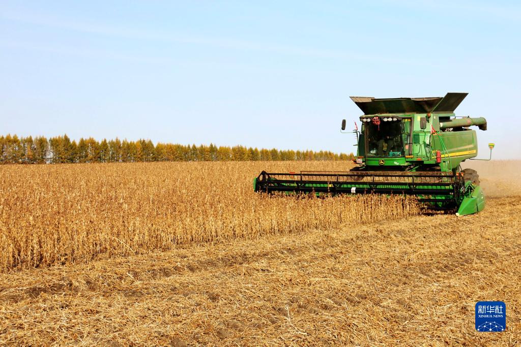 這是10月8日在黑龍江省黑河市拍攝的秋收場(chǎng)景。