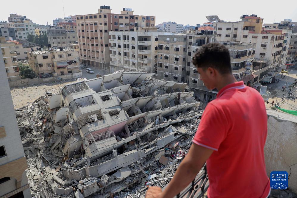 10月8日,在加沙城,一名男子望向以色列空襲后的建筑廢墟。