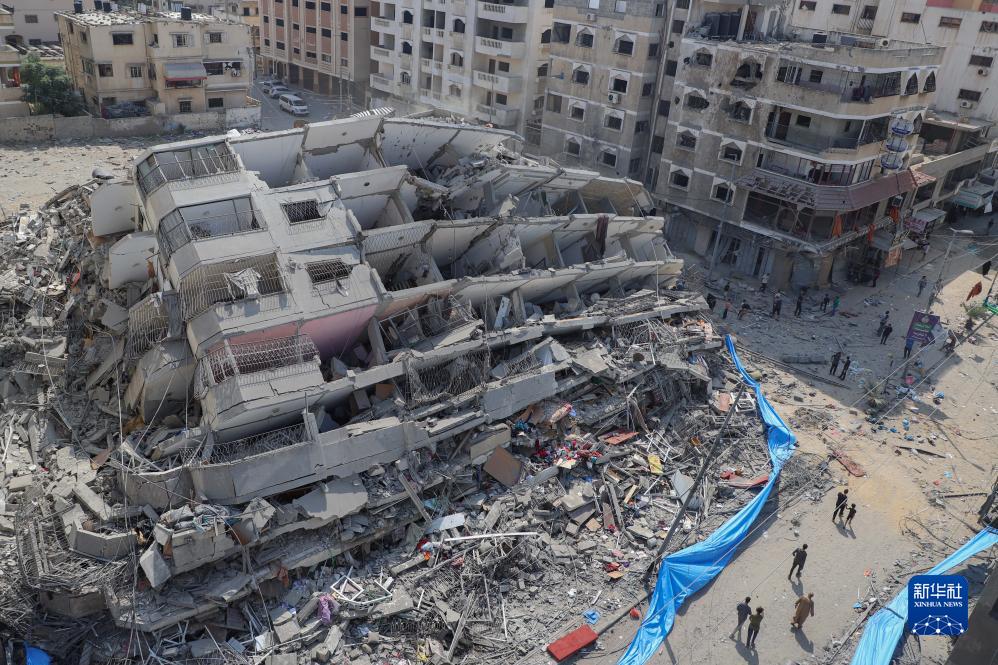 這是10月8日在加沙城拍攝的以色列空襲后的建筑廢墟。