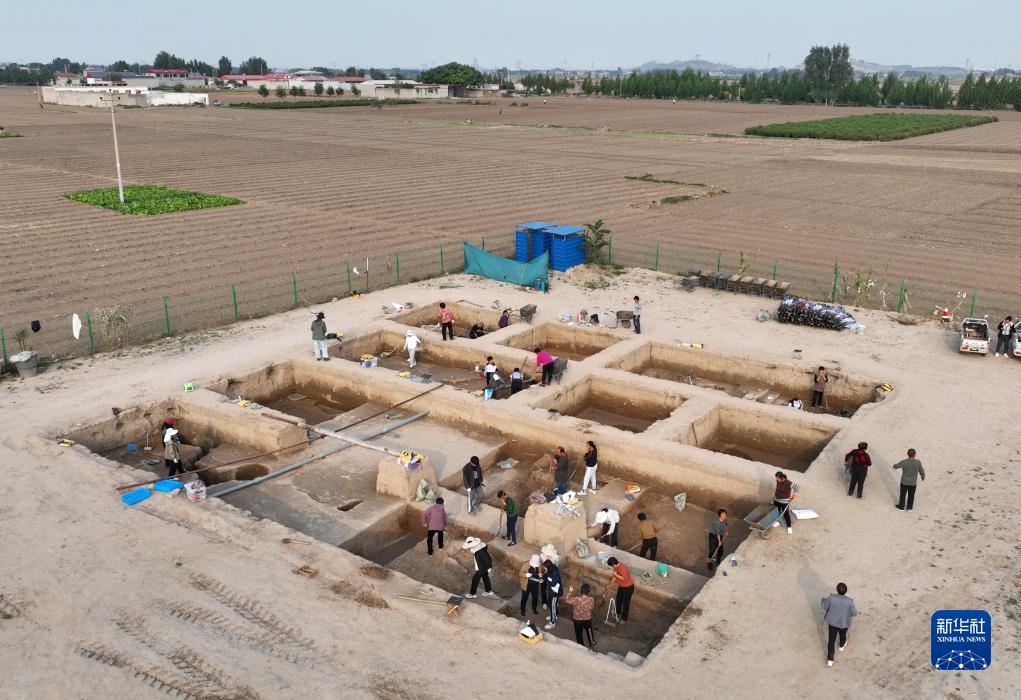 考古隊員在河北省隆堯縣柏人城遺址第四次考古發(fā)掘現場(chǎng)作業(yè)(10月8日攝,無(wú)人機照片)。