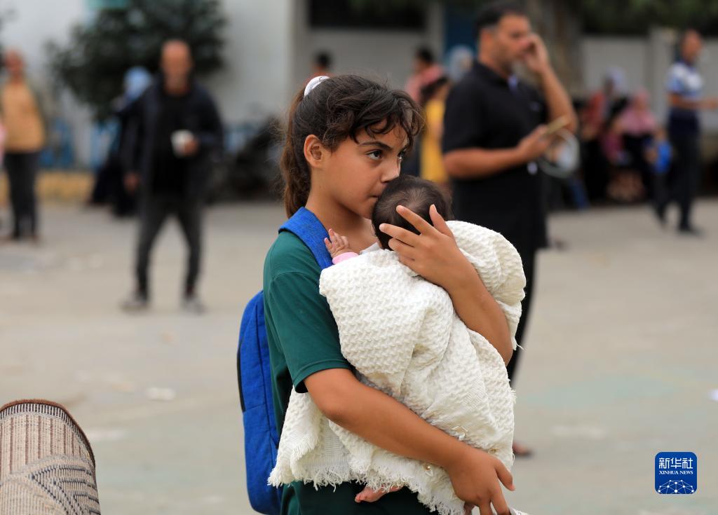 10月9日,巴勒斯坦人在加沙地帶南部城市汗尤尼斯的一所學(xué)校躲避以色列空襲。