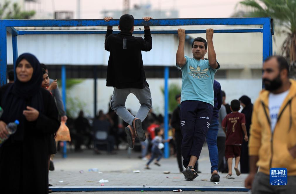 10月9日,巴勒斯坦人在加沙地帶南部城市汗尤尼斯的一所學(xué)校躲避以色列空襲。