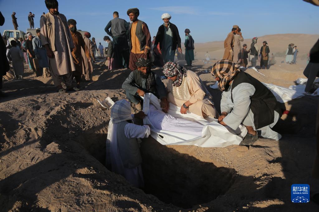 10月9日,在阿富汗西部赫拉特省津達詹區,民眾埋葬地震遇難者。