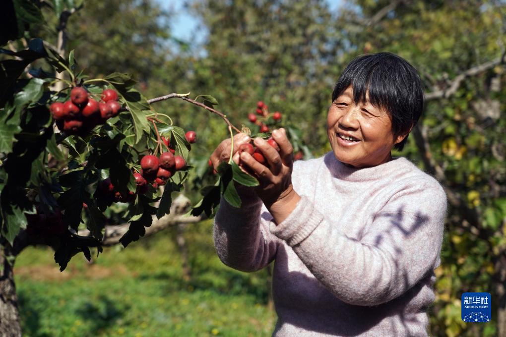 10月10日,村民在北京市平谷區熊兒寨鄉魏家灣村的一處紅果種植園采摘紅果。