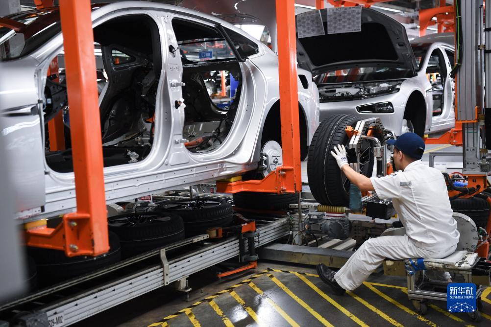 10月9日,工作人員在廣東肇慶小鵬汽車(chē)智能網(wǎng)聯(lián)科技產(chǎn)業(yè)園內的總裝生產(chǎn)線(xiàn)上工作。