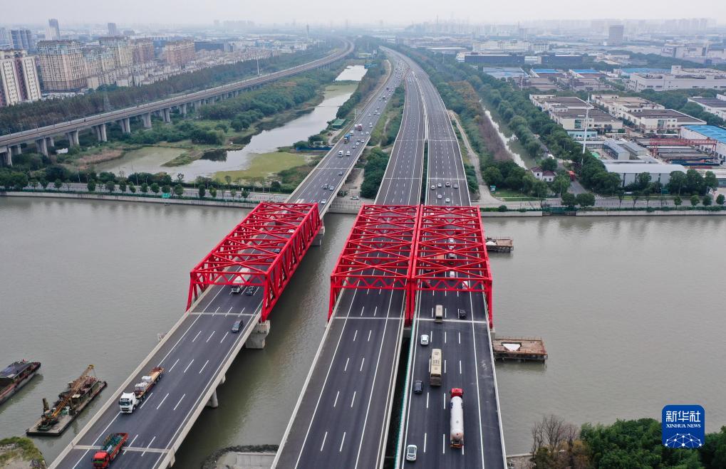 10月10日,車(chē)輛通過(guò)滬寧高速公路青陽(yáng)港大橋(無(wú)人機照片)。