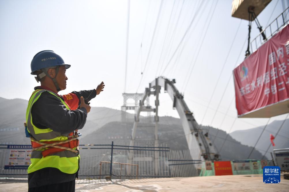 10月10日,中鐵二十局工人在陜西東莊水利樞紐涇河大橋施工現場(chǎng)指揮吊機進(jìn)行吊裝作業(yè)。