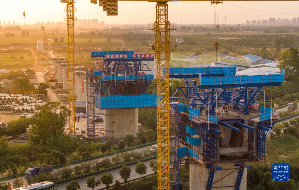 10月9日,中鐵四局施工人員在阜淮鐵路跨G329國道連續梁施工現場(chǎng)作業(yè)。