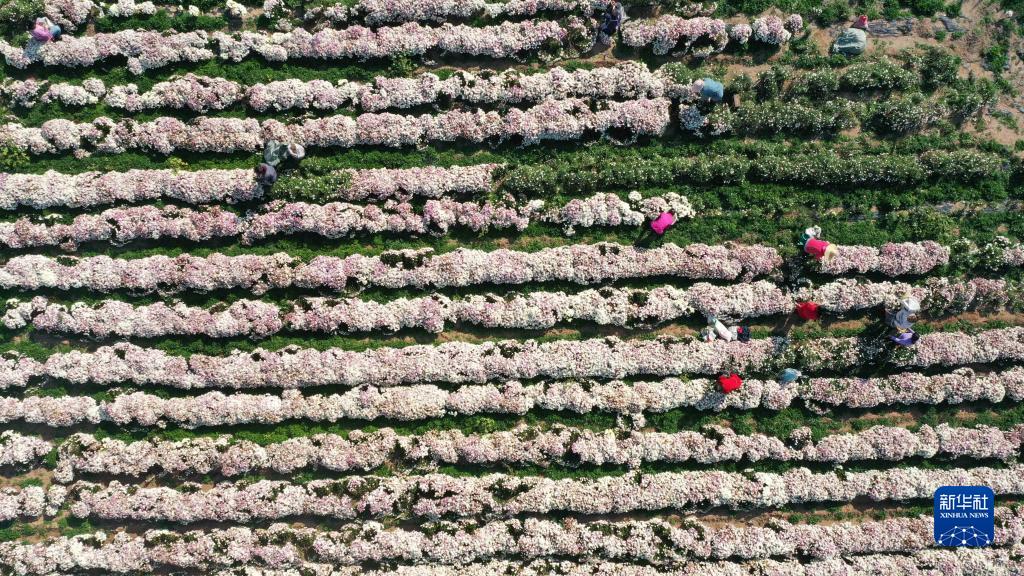 10月10日,農民在河北省石家莊市井陘礦區賈莊村太行白菊種植基地采收菊花(無(wú)人機照片)。