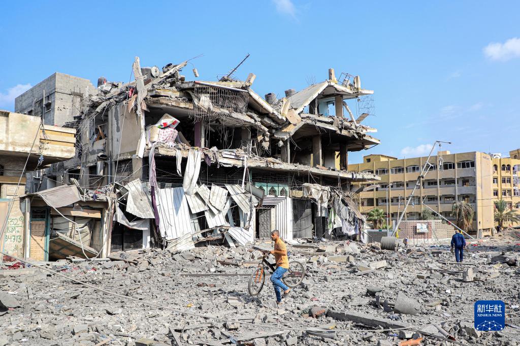 10月10日,在加沙城,人們走過(guò)被以色列空襲炸毀的建筑廢墟。
