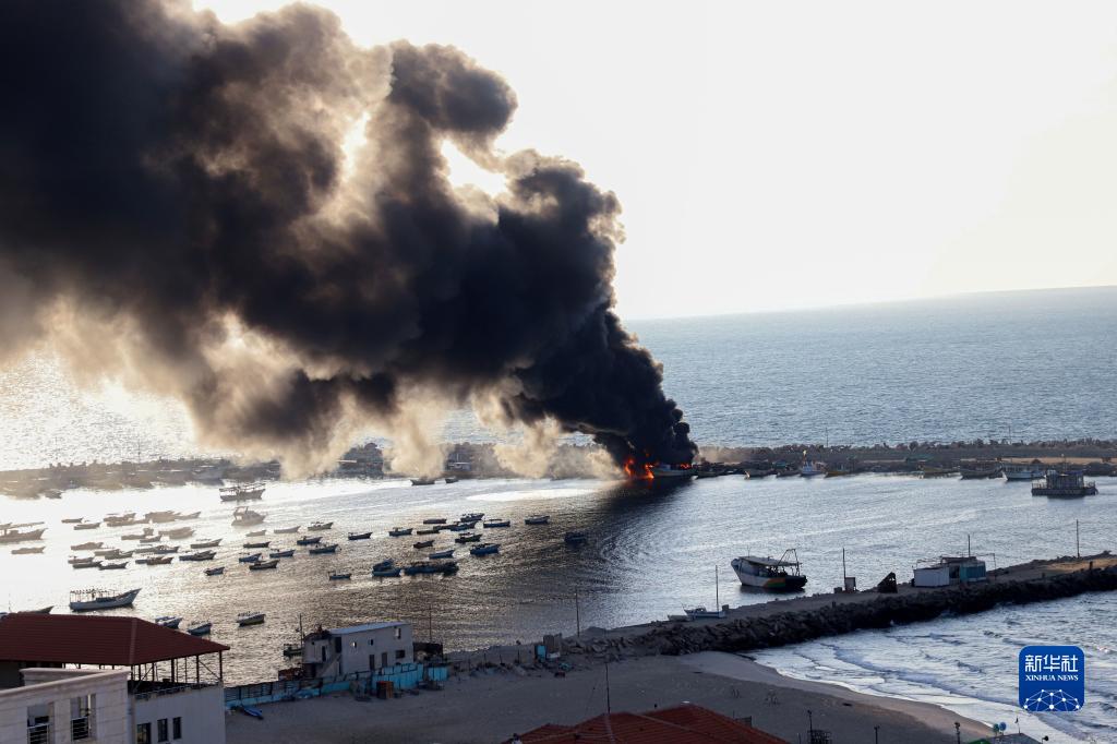 10月10日,加沙城港口遭以色列襲擊后升起濃煙。