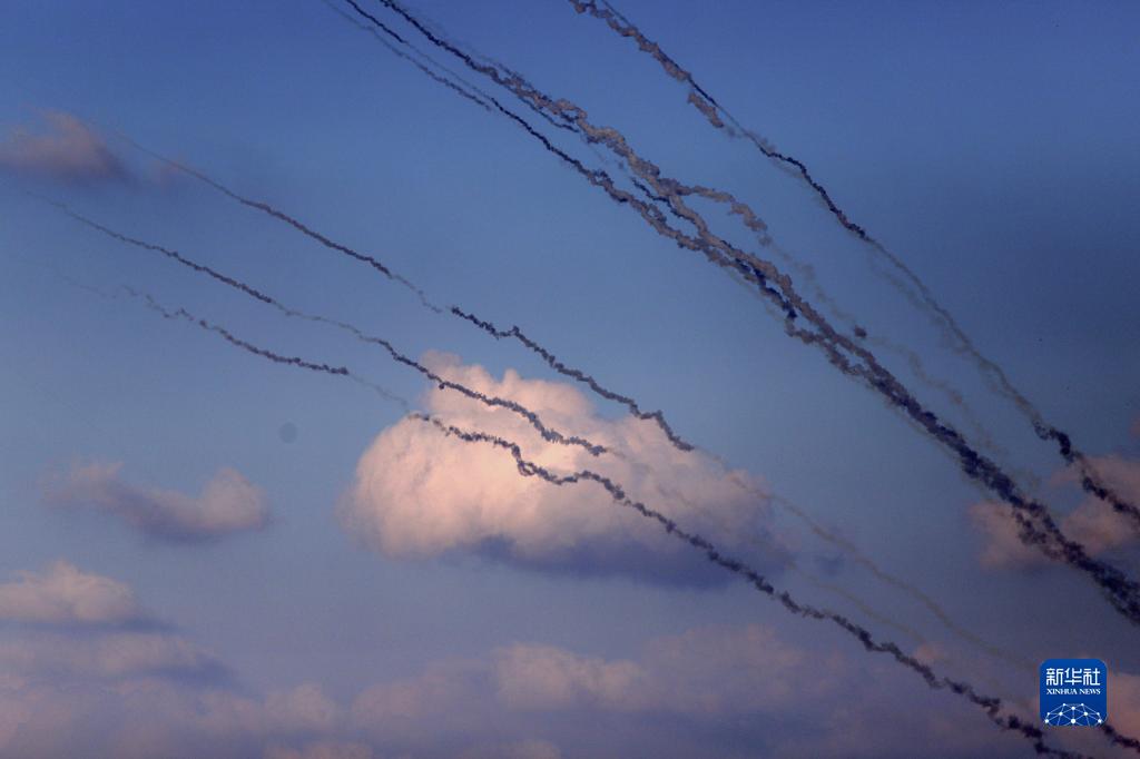 這是10月10日在加沙城拍攝的向以色列發(fā)射的火箭彈留下的煙跡。