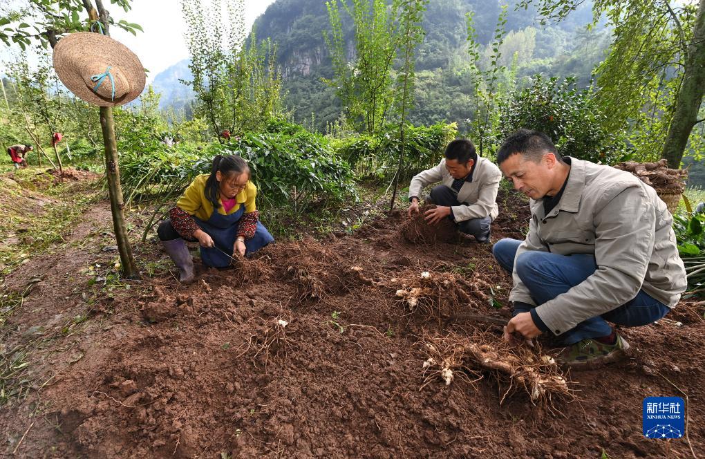 10月10日,在重慶市石柱土家族自治縣中益鄉華溪村,村民在種植園內收獲黃精。