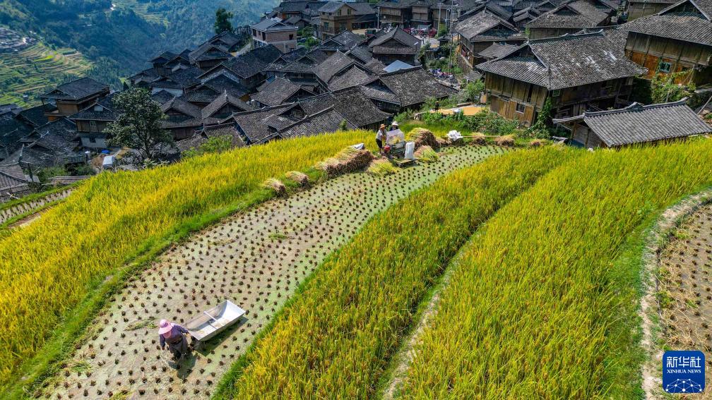 貴州省黔東南苗族侗族自治州從江縣加榜鄉加車(chē)村的村民在田間收獲稻谷(2022年9月18日攝,無(wú)人機照片)。