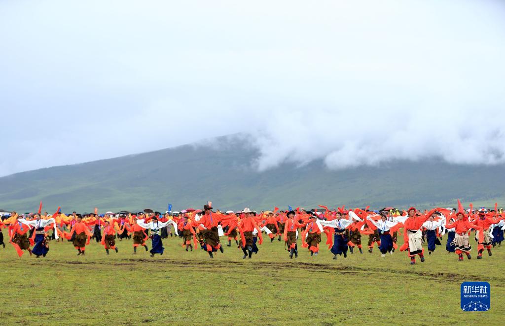 當地藏族群眾在四川甘孜藏族自治州理塘縣的毛埡草原上跳舞(2023年7月24日攝)。