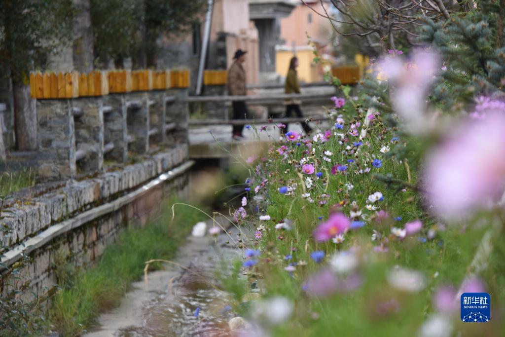 10月10日,在四川甘孜藏族自治州理塘縣,人們從一座石橋上走過(guò)。