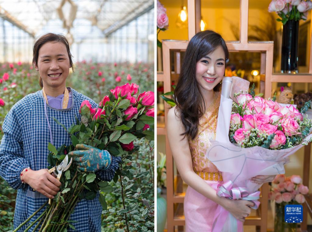 拼版照片顯示,左圖:2019年2月15日,在中國云南石林彝族自治縣錦苑花卉產(chǎn)業(yè)園,花農抱著(zhù)鮮花微笑(新華社記者 胡超 攝);右圖:2019年2月16日,在泰國曼谷,一位女士抱著(zhù)購買(mǎi)到的鮮花微笑(新華社記者 張可任 攝)。