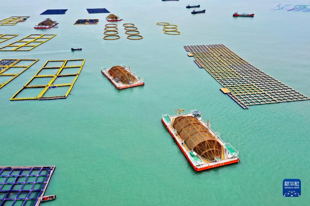 這是10月10日拍攝的福建省連江縣定海灣內的深遠海養殖平臺及深水網(wǎng)箱、漁排(無(wú)人機照片)。