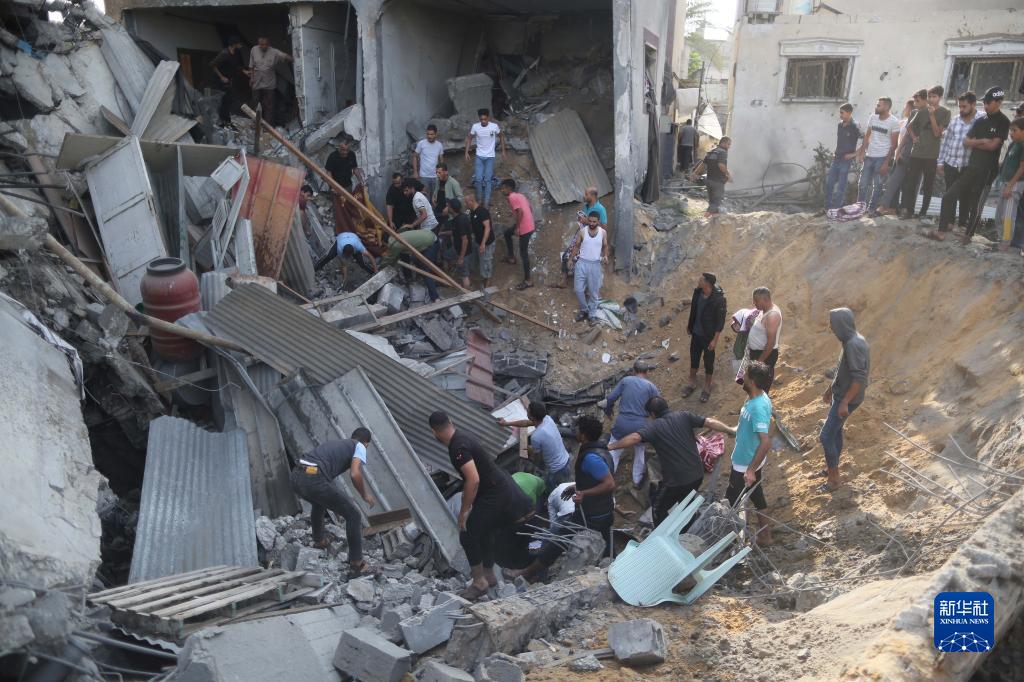 10月11日,在加沙地帶南部城市汗尤尼斯,人們在被以色列空襲摧毀的建筑廢墟中尋找幸存者。