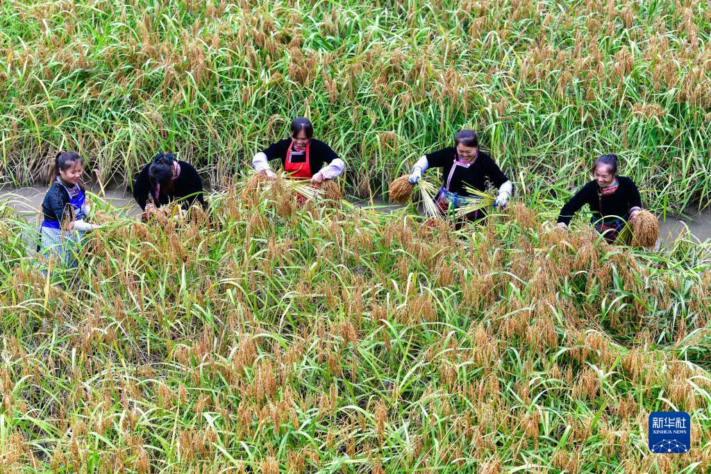 10月11日,村民在貴州省從江縣高增鄉建華村采收香禾糯稻谷。