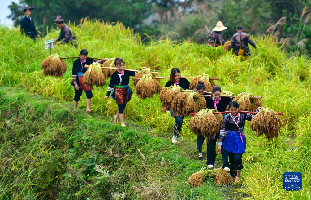 10月11日,村民在貴州省從江縣高增鄉建華村挑運香禾糯稻谷。