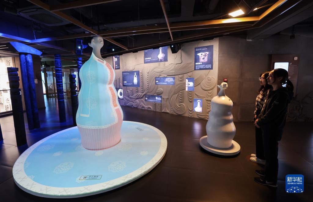 10月11日拍攝的多媒體互動(dòng)裝置“千源"?!扒г?以新石器時(shí)代遺址中出土的人首陶瓶造型為靈感,當游客靠近裝置,人首陶瓶上會(huì )出現不同的傳統服飾。