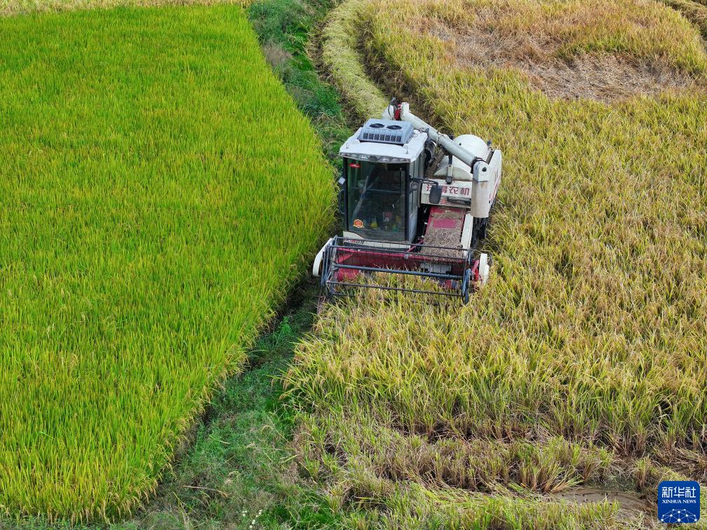 10月11日,在湖南省長(cháng)沙市望城區烏山街道維梓村,農戶(hù)駕駛收割機在農田里收割水稻(無(wú)人機照片)。