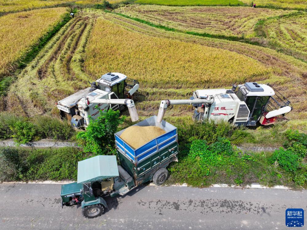 金秋時(shí)節,湖南省長(cháng)沙市望城區烏山街道維梓村種植的中稻迎來(lái)收獲季,當地農戶(hù)搶抓農時(shí)收割水稻、烘干稻谷,確保顆粒歸倉。