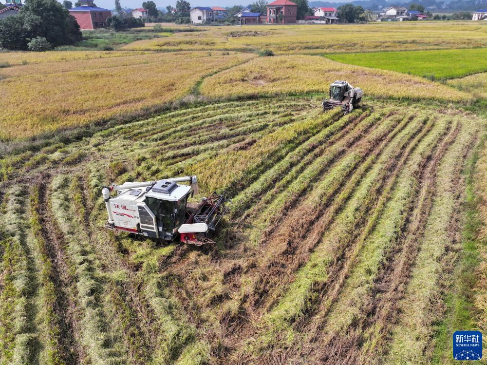 金秋時(shí)節,湖南省長(cháng)沙市望城區烏山街道維梓村種植的中稻迎來(lái)收獲季,當地農戶(hù)搶抓農時(shí)收割水稻、烘干稻谷,確保顆粒歸倉。