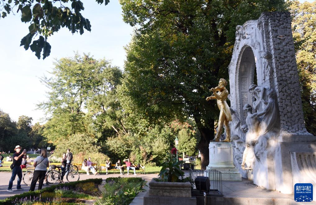 10月2日,游客在奧地利維也納的小約翰·施特勞斯雕像前參觀(guān)拍照。