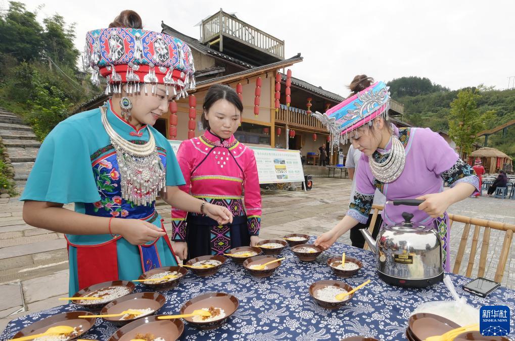10月10日,在重慶市石柱土家族自治縣橋頭鎮的陶然居瓦屋小寨,當地村民身著(zhù)民族服裝為游客準備當地特色飲品“米米茶”。