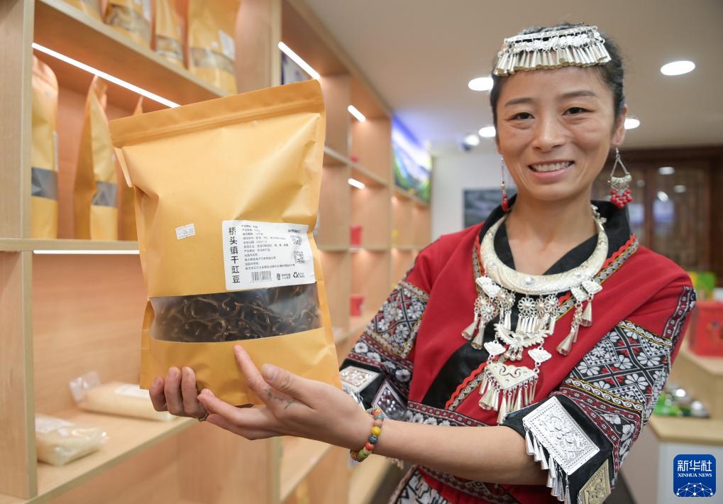 10月10日,在位于橋頭鎮的陶然居瓦屋小寨內的鄉村振興體驗館內,一名工作人員介紹當地土特產(chǎn)。