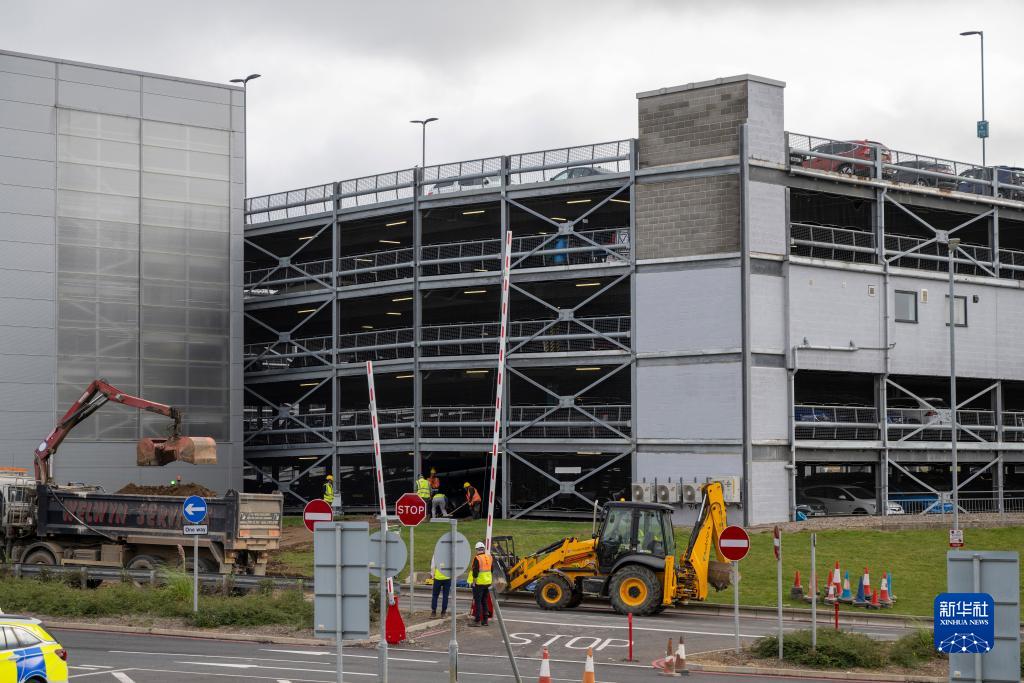 10月11日,在英國倫敦盧頓機場(chǎng),工作人員在失火停車(chē)場(chǎng)附近工作。
