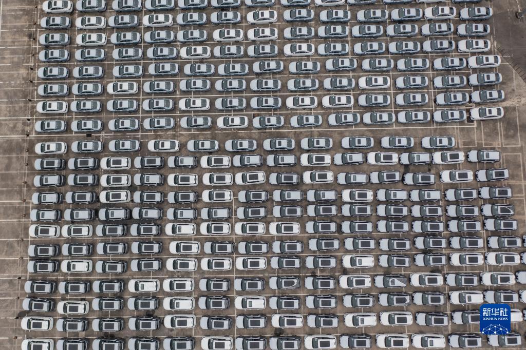 這是10月11日在重慶國際物流樞紐園區拍攝的等待出口的汽車(chē)(無(wú)人機照片)。