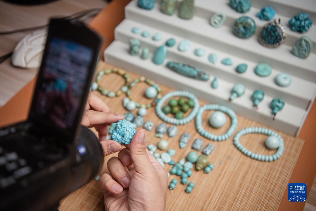 10月11日,湖北省鄖西縣下?tīng)I村村民庹濤在直播銷(xiāo)售綠松石制品。